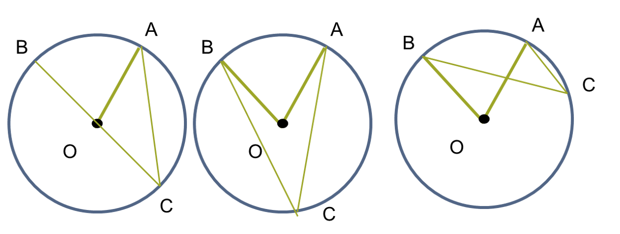 נבחין בין שלושה מקרים: מיקום הזוית המרכזית ביחס לזוית ההיקפית הנשענת על אותה קשת.
