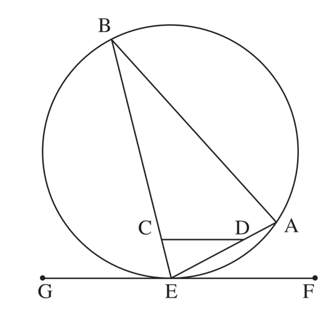המשולש AEB חסום במעגל. הקטע GF משיק למעגל בנקודה E.