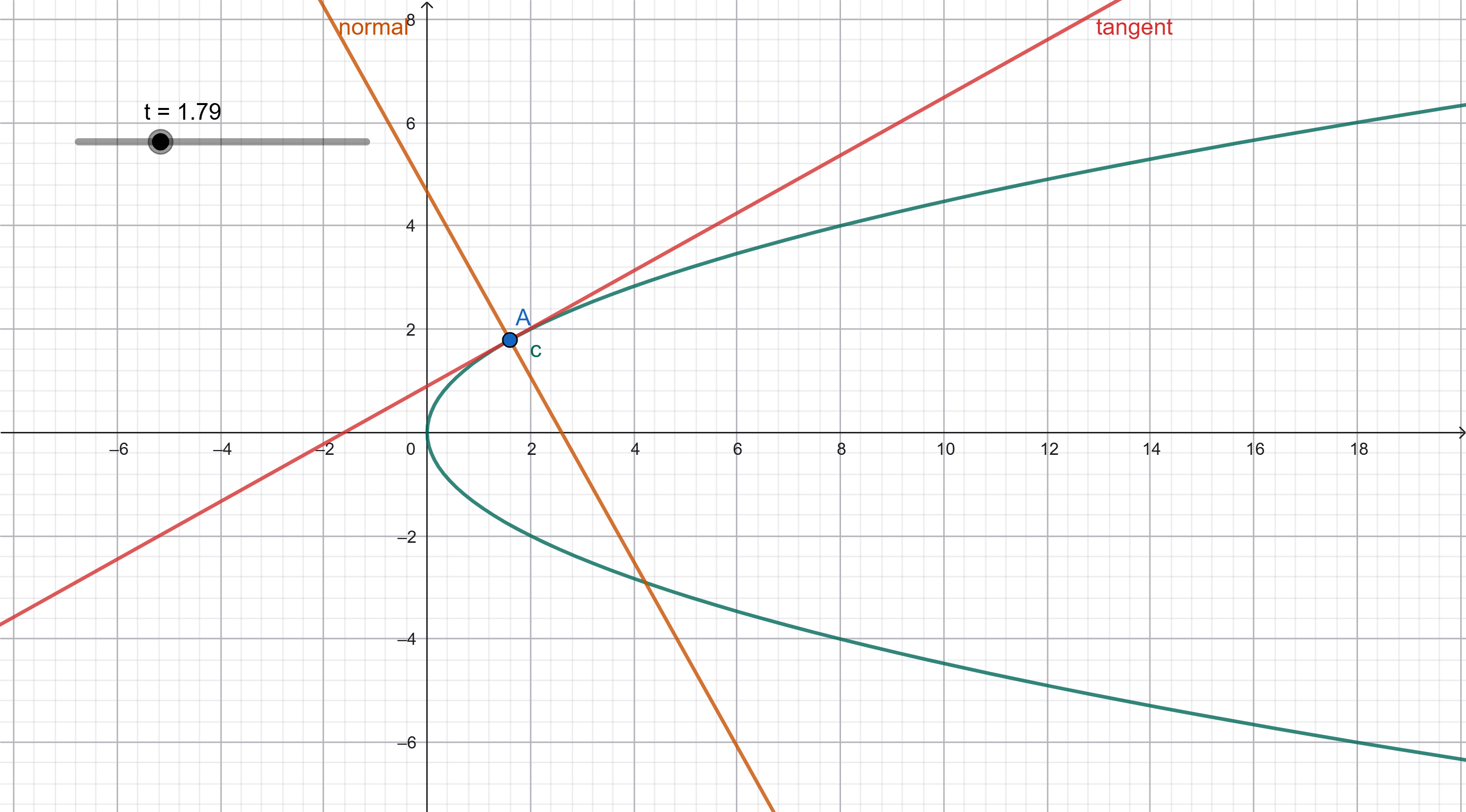 גררו את הנקודה על הפרבולה ושימו לב כיצד המשיק והאנך משתנים.